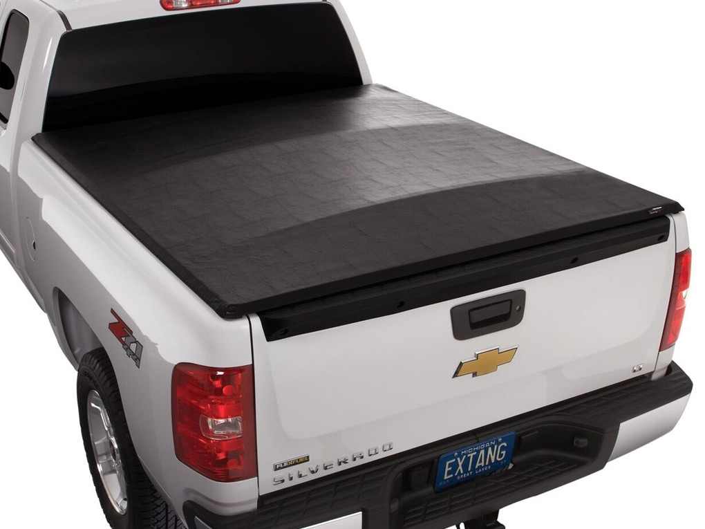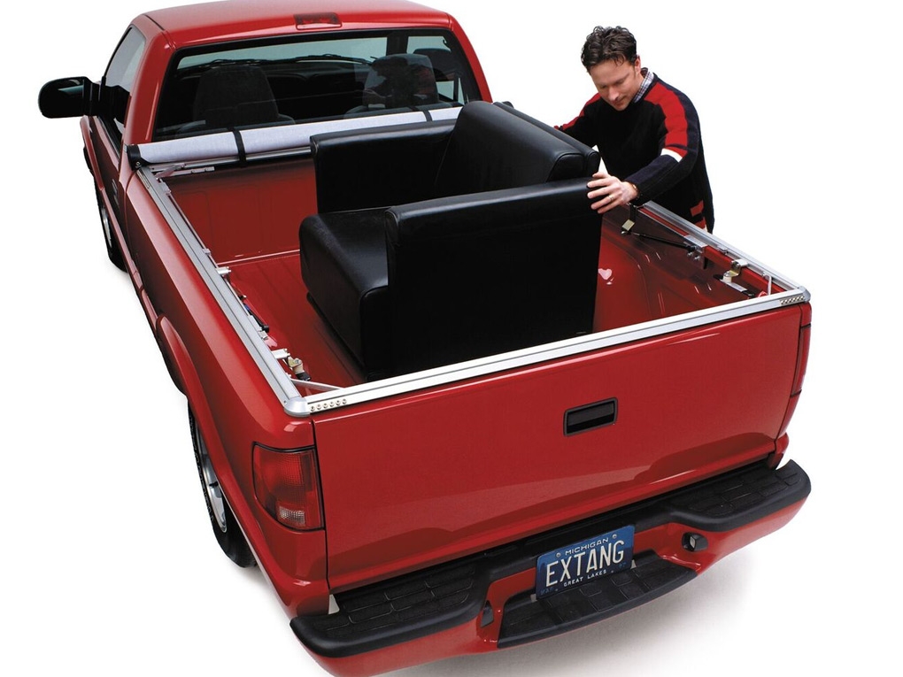 Extang offers roll-up, snap and snapless tonneau covers. Extang roll-up tonneau covers provide the latest in function and full use of your truck bed. Heavy-duty bows are pre-positioned and conveniently roll-up with the tarp providing quick access to your cargo. The snap/snapless tonneaus utilize an aluminum frame that clamps to the top of the truck bed. The four sides of the frame and removable bows are custom designed to fit each truck perfectly. Premium fabric tarps are cut on a CNC to exact dimensions and attach to the frame with either snaps or unique J-hooks providing a strong and smooth look.